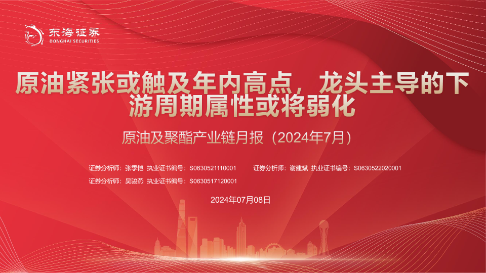【东海证券】【20240708】原油及聚酯产业链月报(2024年7月):原油紧张或触及年内高点,龙头主导的下游周期属性或将弱化-29页