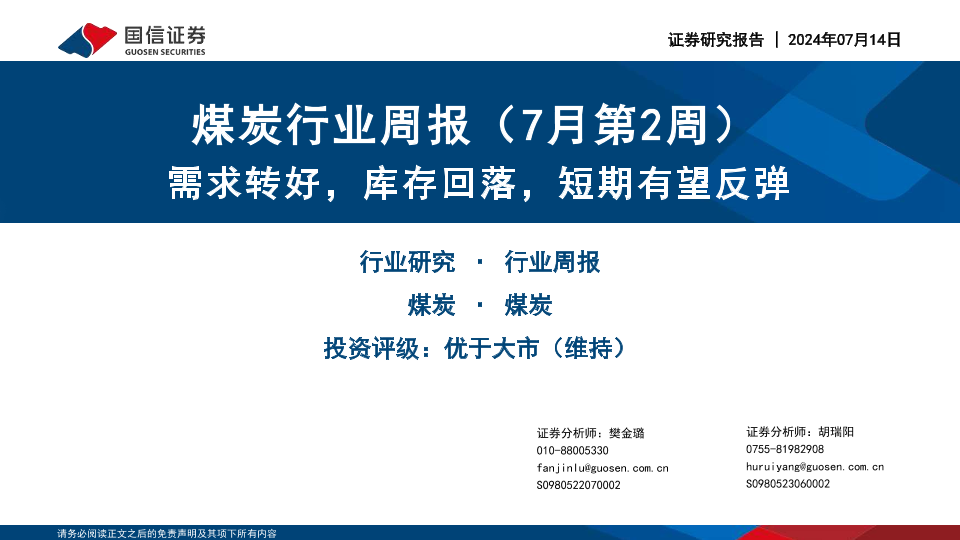 【国信证券】【20240714】煤炭行业周报(7月第2周):需求转好,库存回落,短期有望反弹-30页