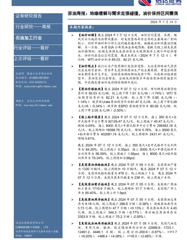 【信达证券】【20240714】原油周报:地缘缓解与需求走强碰撞,油价保持区间震荡-28页