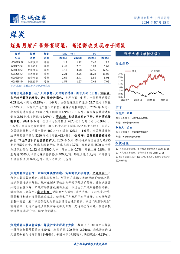 【长城证券】【20240715】煤炭月度产量修复明显,高温需求兑现晚于同期-14页