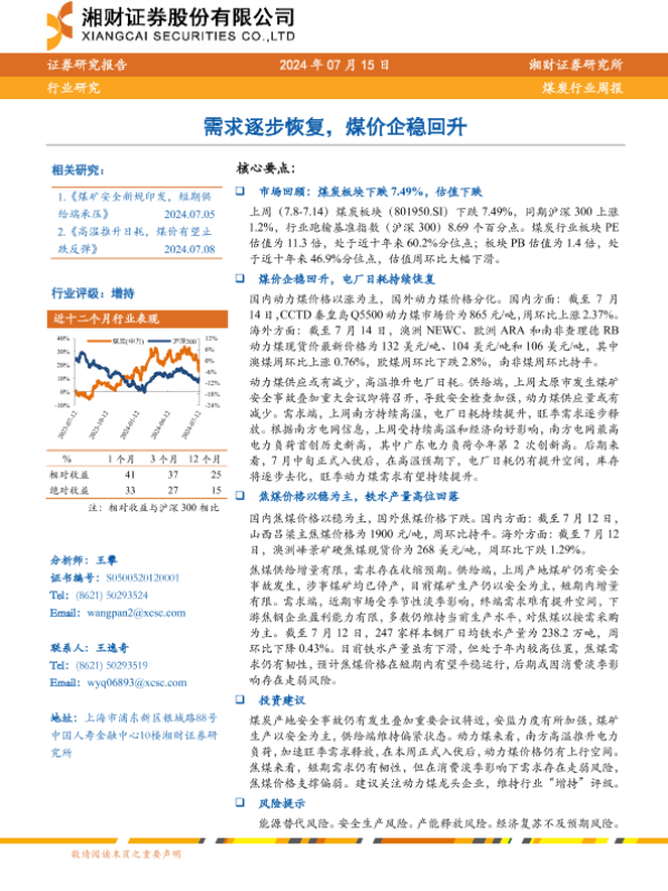 【湘财证券】【20240715】20240715-湘财证券-煤炭行业周报:需求逐步恢复,煤价企稳回升-14页