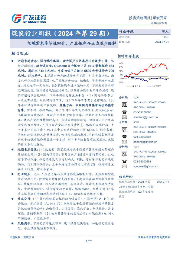 【广发证券】【20240721】20240721-广发证券-煤炭行业周报(2024年第29期):电煤需求季节性回升,产业链库存压力逐步缓解-17页
