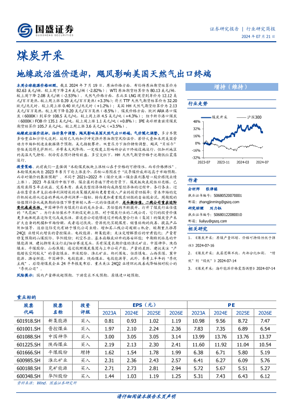 【国盛证券】【20240721】煤炭开采:地缘政治溢价退却,飓风影响美国天然气出口终端-12页
