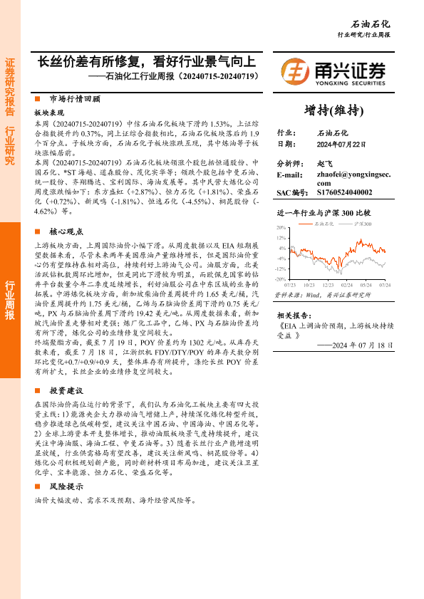 【甬兴证券】【20240722】20240722-甬兴证券-石油化工行业周报:长丝价差有所修复,看好行业景气向上-11页