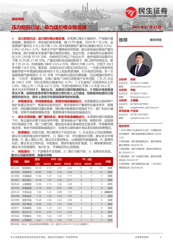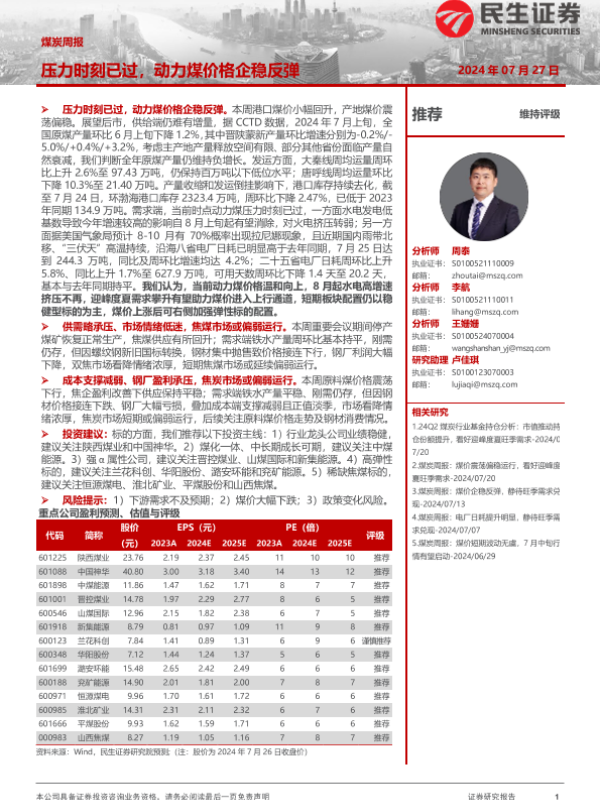 【民生证券】【20240727】20240727-民生证券-煤炭周报:压力时刻已过,动力煤价格企稳反弹-23页