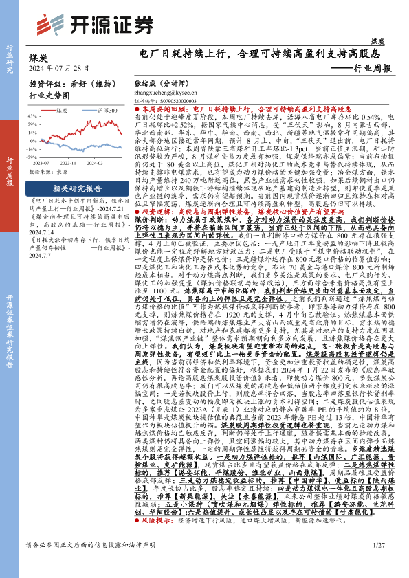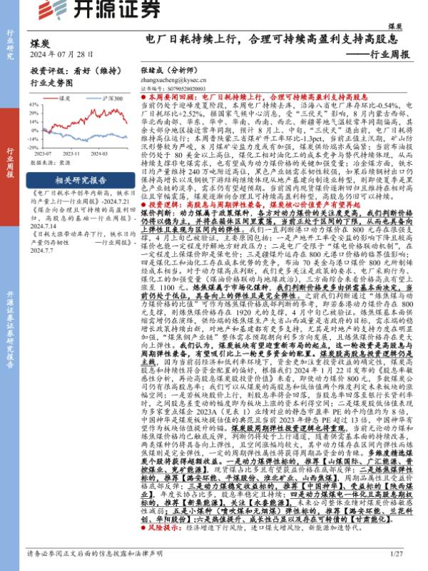 【开源证券】【20240728】电厂日耗持续上行,合理可持续高盈利支持高股息行业周报-27页