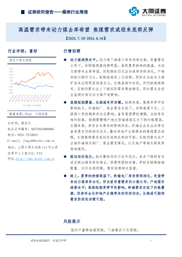 【大同证券】【20240804】20240804-大同证券-煤炭行业周报:高温需求带来动力煤去库希望,焦煤需求或迎来底部反弹-11页