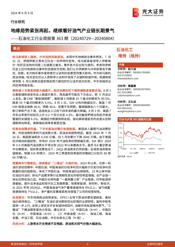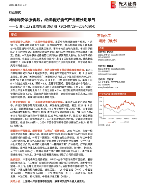 【光大证券】【20240804】20240804-光大证券-石油化工行业周报第363期:地缘局势紧张再起,继续看好油气产业链长期景气-21页