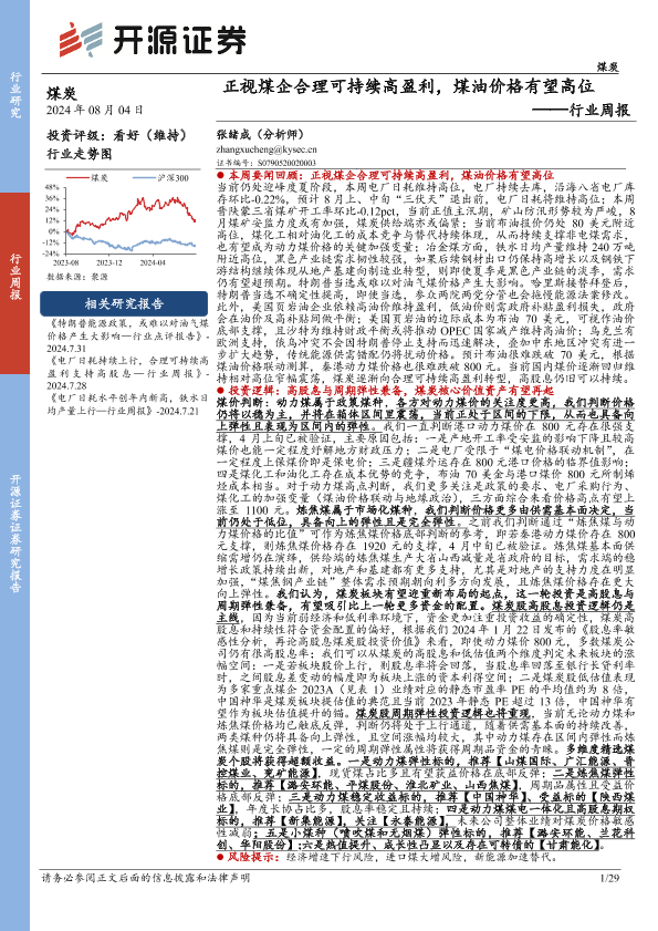 【开源证券】【20240804】煤炭行业周报:正视煤企合理可持续高盈利,煤油价格有望高位-29页