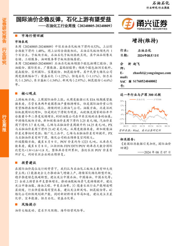 【甬兴证券】【20240813】20240813-甬兴证券-石油化工行业周报:国际油价企稳反弹,石化上游有望受益-11页