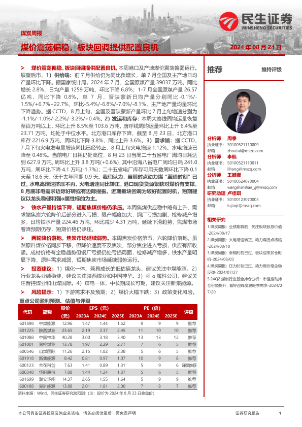 【民生证券】【20240824】20240824-民生证券-煤炭周报:煤价震荡偏稳,板块回调提供配置良机-23页