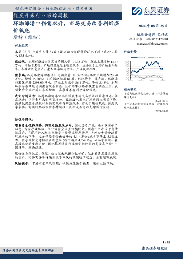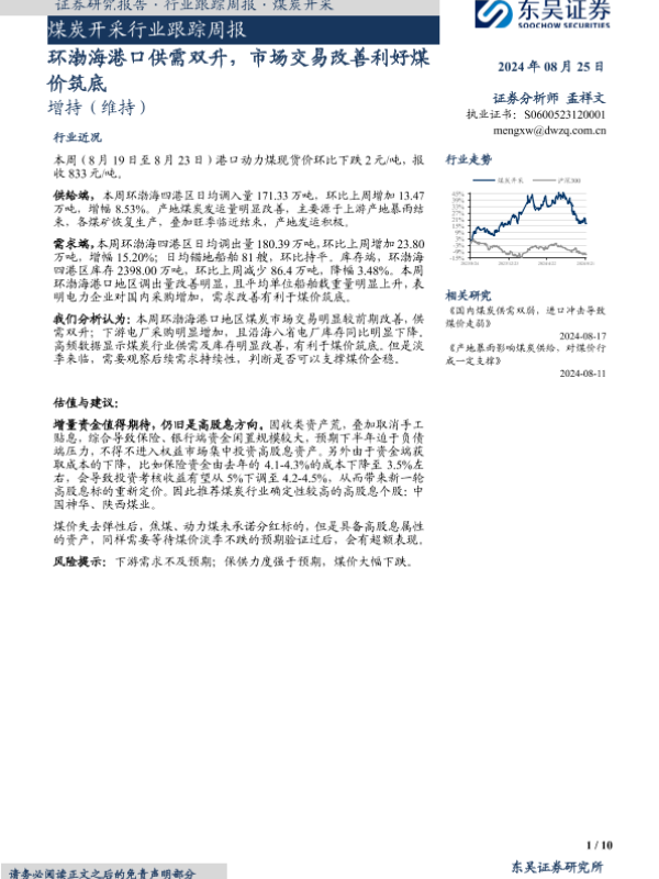 【东吴证券】【20240825】20240825-东吴证券-煤炭开采行业跟踪周报:环渤海港口供需双升,市场交易改善利好煤价筑底-10页