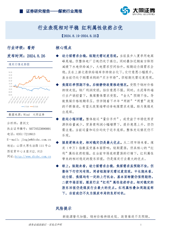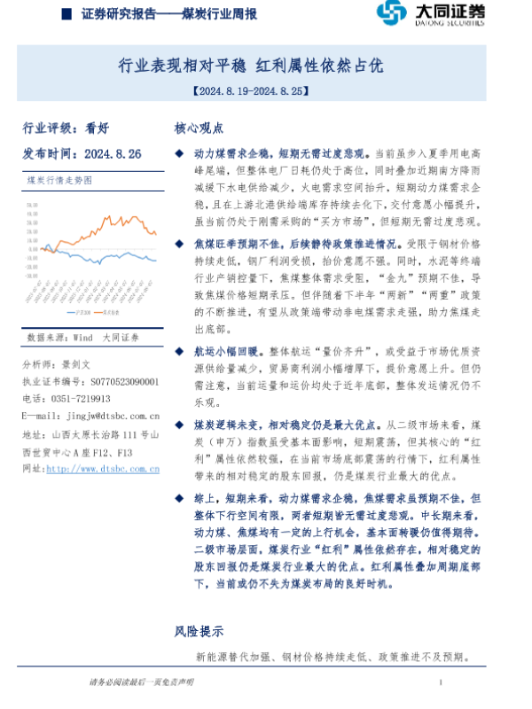 【大同证券】【20240826】20240826-大同证券-煤炭行业周报:行业表现相对平稳,红利属性依然占优-10页