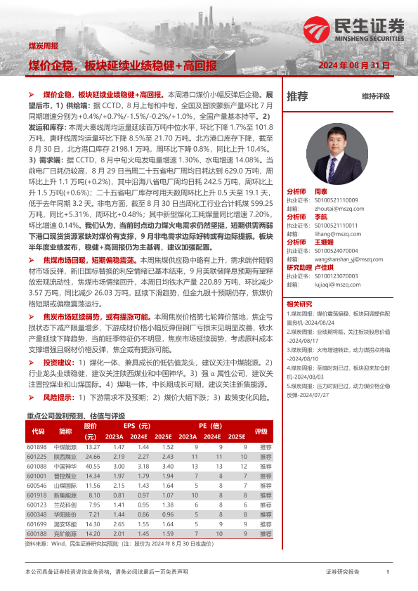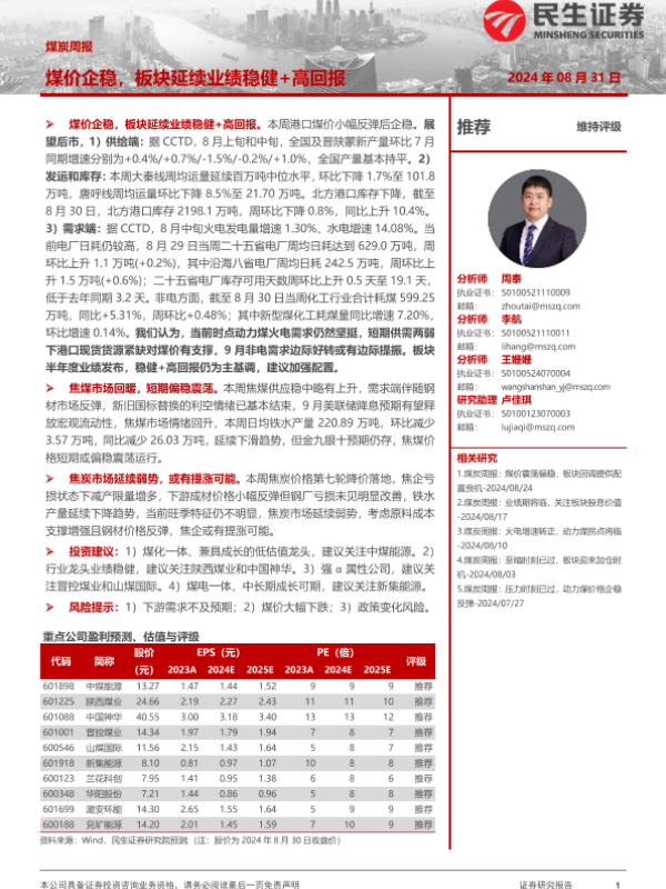 【民生证券】【20240831】20240831-民生证券-煤炭周报:煤价企稳,板块延续业绩稳健+高回报-24页