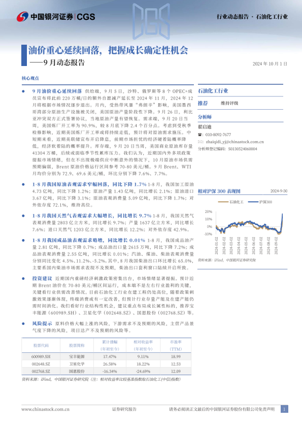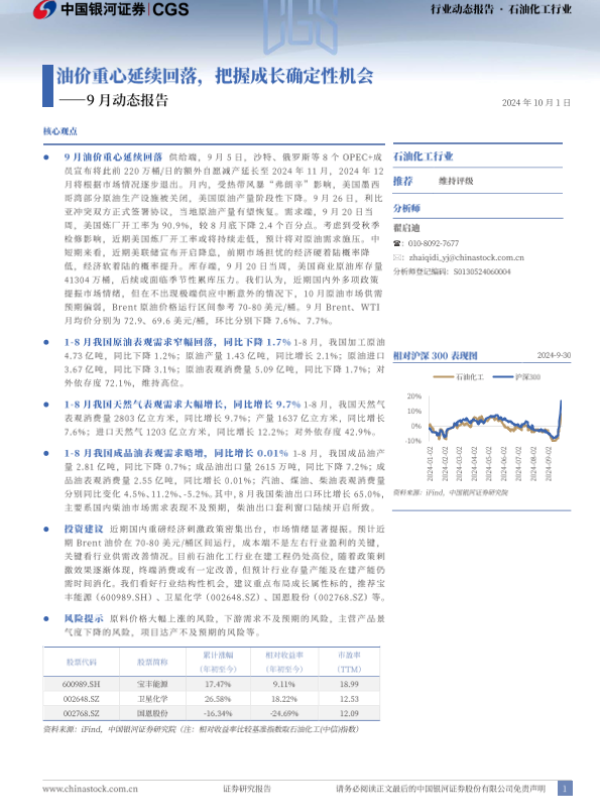 【银河证券】【20241001】20241001-中国银河-石油化工行业9月动态报告:油价重心延续回落,把握成长确定性机会-22页