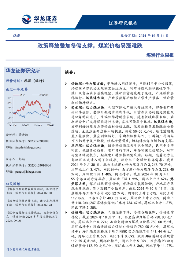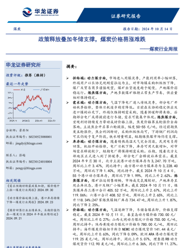 【华龙证券】【20241014】煤炭行业周报:政策释放叠加冬储支撑,煤炭价格易涨难跌-13页