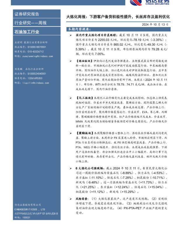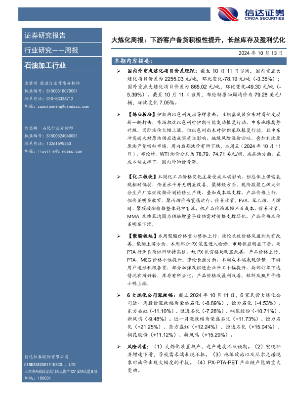 【信达证券】【20241013】大炼化周报:下游客户备货积极性提升,长丝库存及盈利优化-21页