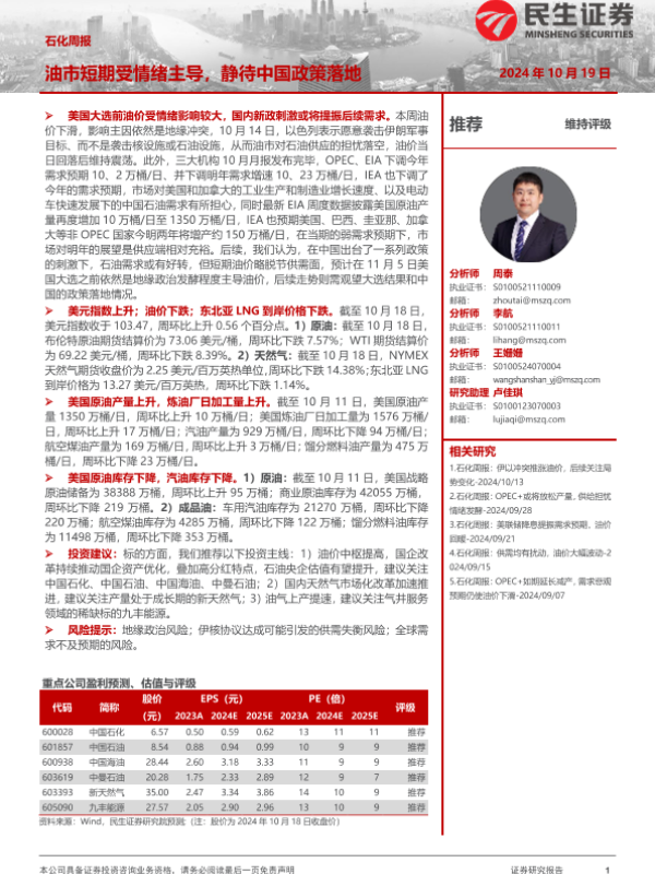 【民生证券】【20241019】20241019-民生证券-石化周报:油市短期受情绪主导,静待中国政策落地-28页