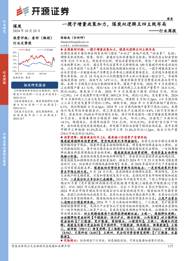 【开源证券】【20241020】煤炭行业周报:一揽子增量政策加力,煤炭双逻辑且四主线布局-27页