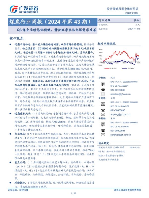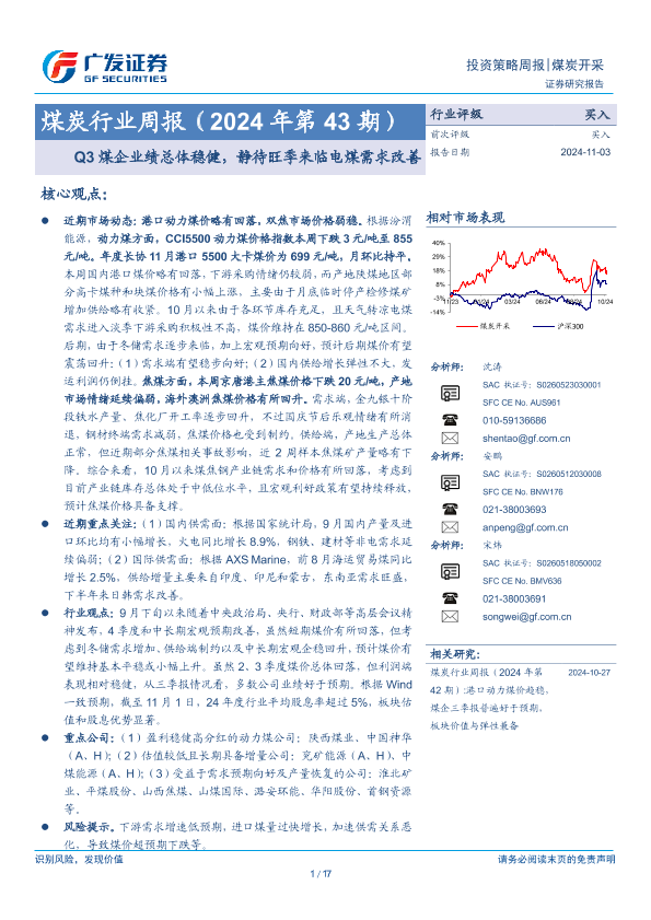【广发证券】【20241103】2024年第43期煤炭行业周报:Q3煤企业绩总体稳健,静待旺季来临电煤需求改善-17页