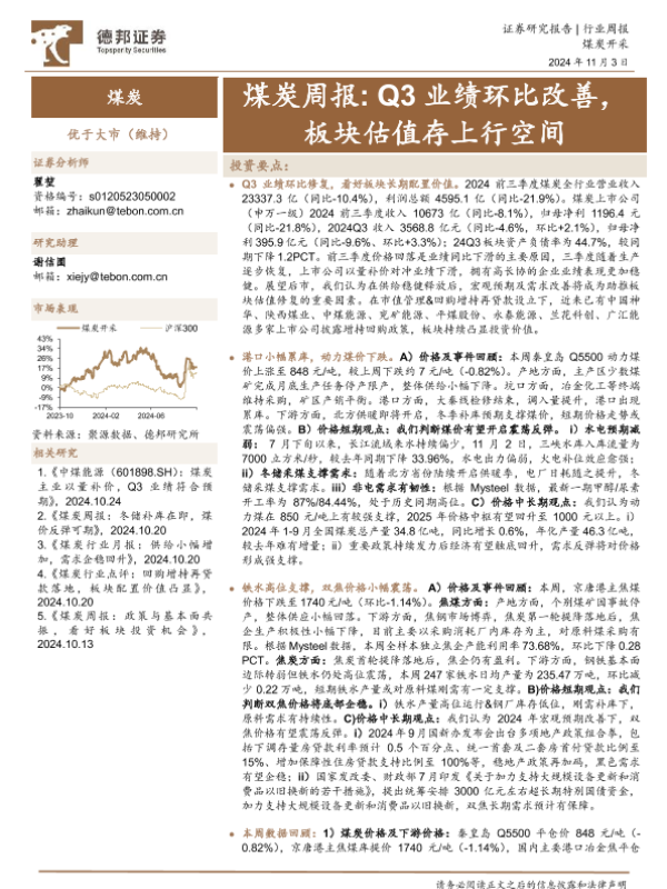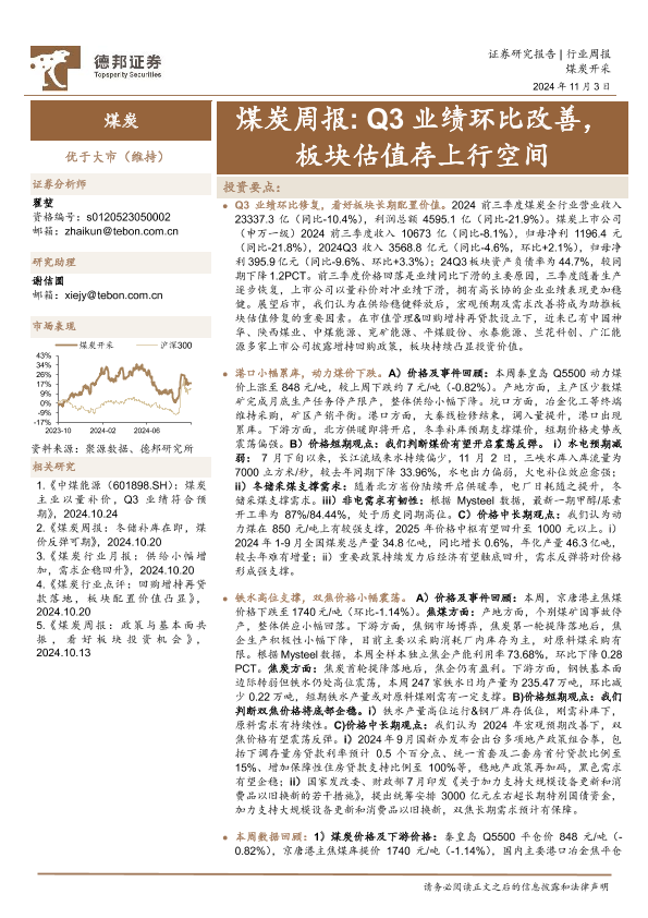 【德邦证券】【20241103】20241103-德邦证券-煤炭周报:Q3业绩环比改善,板块估值存上行空间-16页