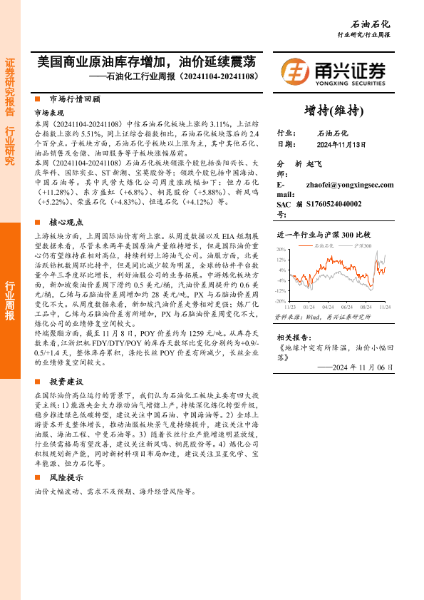 【甬兴证券】【20241113】20241113-甬兴证券-石油化工行业周报:美国商业原油库存增加,油价延续震荡-11页