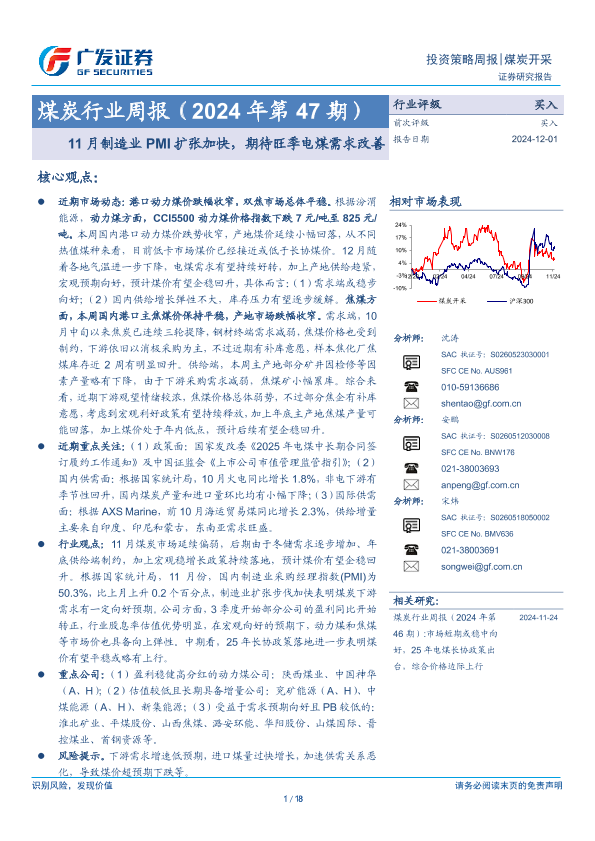 【广发证券】【20241201】20241201-广发证券-煤炭行业周报(2024年第47期):11月制造业PMI扩张加快,期待旺季电煤需求改善-18页