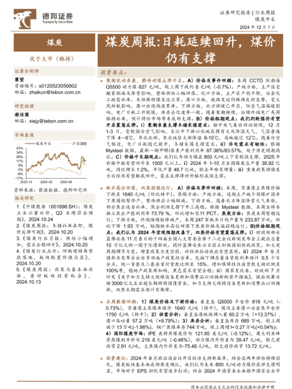 【德邦证券】【20241201】20241201-德邦证券-煤炭周报:日耗延续回升,煤价仍有支撑-17页