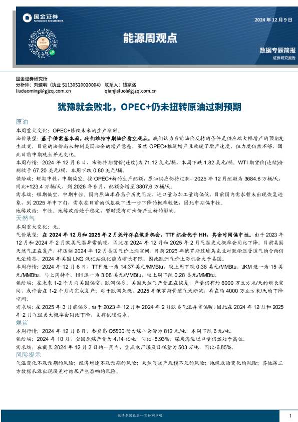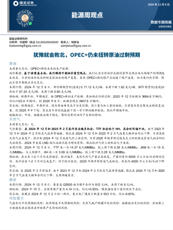 【国金证券】【20241209】20241209-国金证券-能源周观点:犹豫就会败北,OPEC+仍未扭转原油过剩预期-17页