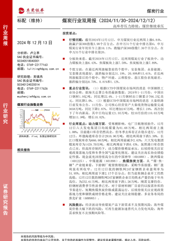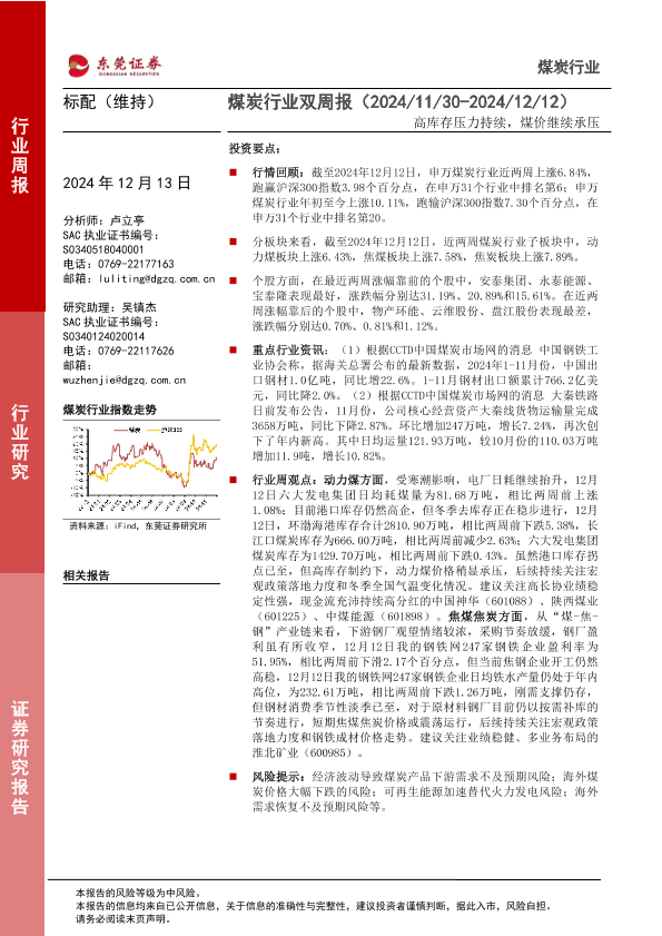 【东莞证券】【20241213】20241213-东莞证券-煤炭行业双周报:高库存压力持续,煤价继续承压-12页