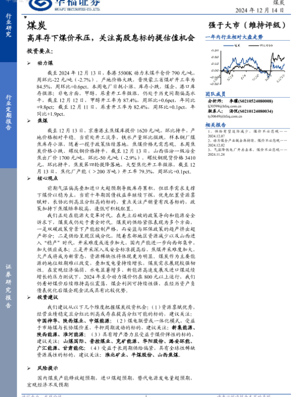 【华福证券】【20241214】煤炭:高库存下煤价承压,关注高股息标的提估值机会-20页