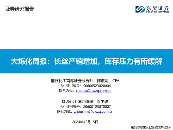 【东吴证券】【20241215】大炼化周报:长丝产销增加,库存压力有所缓解-34页