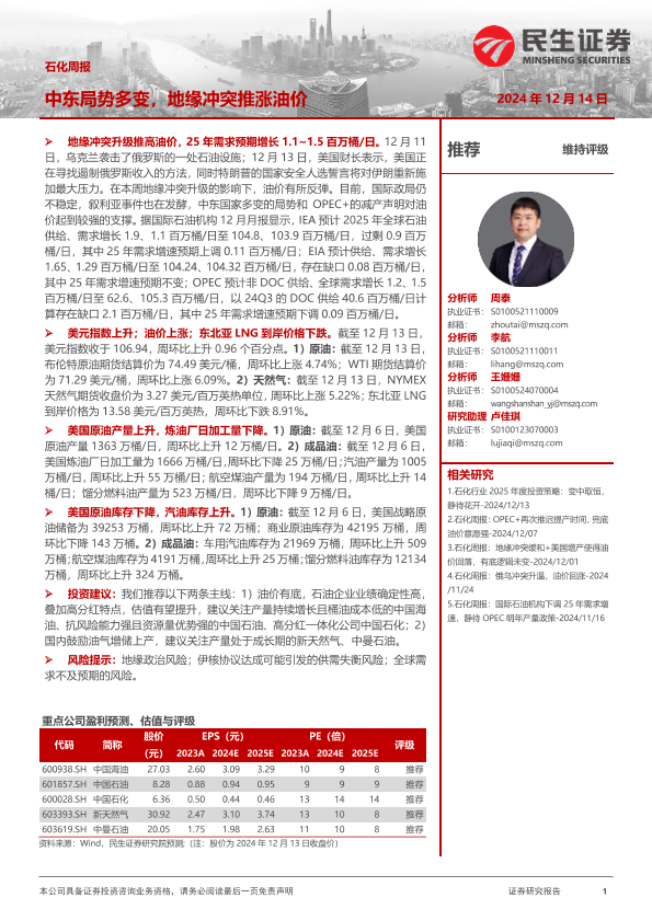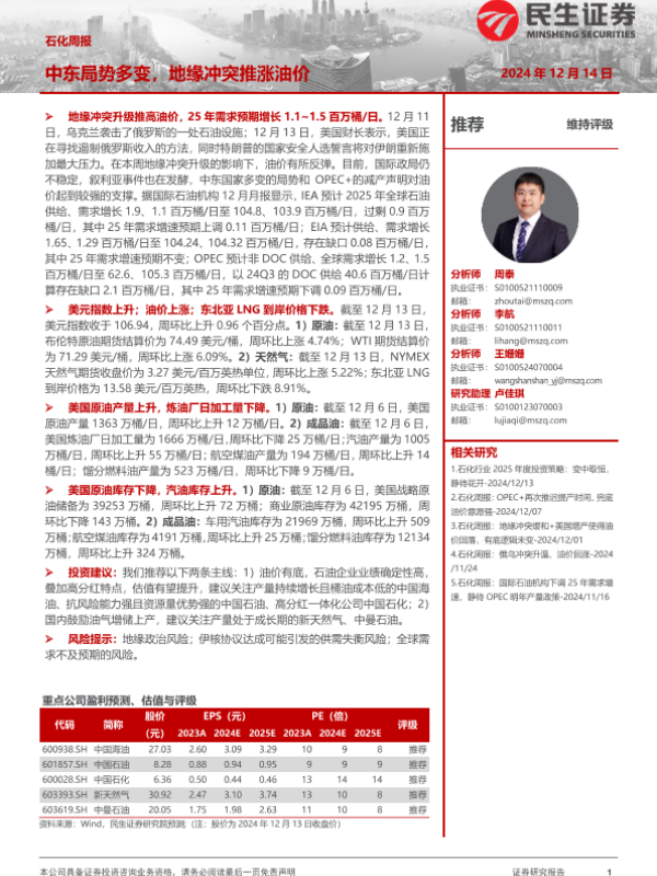 【民生证券】【20241214】石化周报:中东局势多变,地缘冲突推涨油价-27页