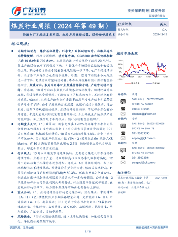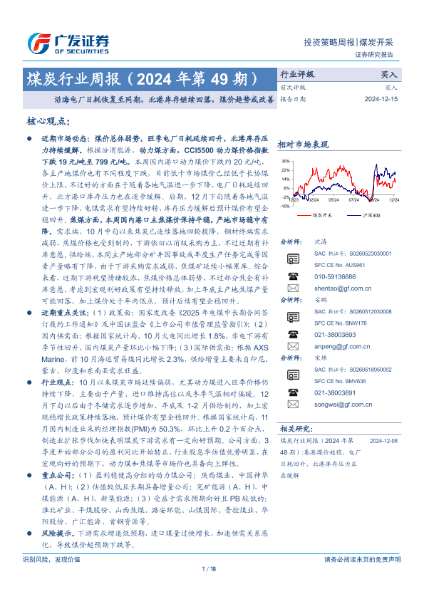 【广发证券】【20241215】煤炭行业周报(2024年第49期):沿海电厂日耗恢复至同期,北港库存继续回落,煤价趋势或改善-18页