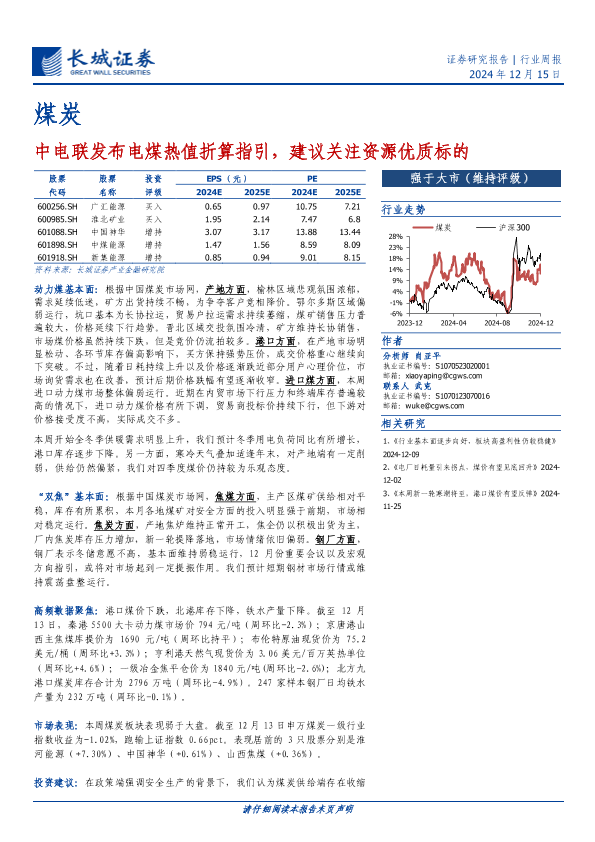 【长城证券】【20241215】煤炭行业周报:中电联发布电煤热值折算指引,建议关注资源优质标的-19页
