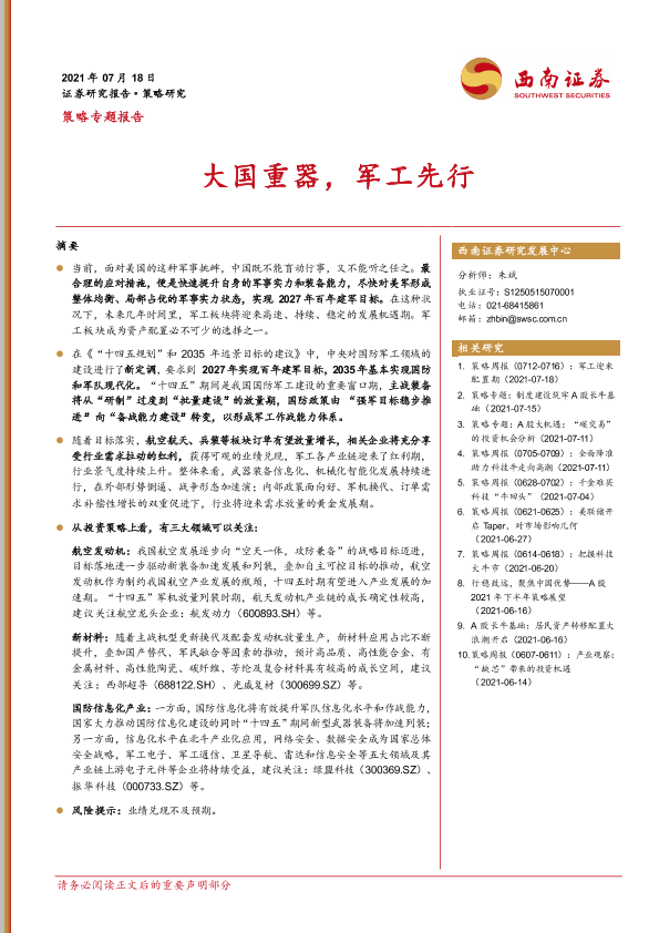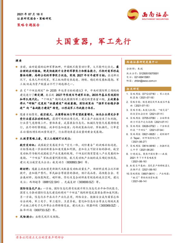 【西南证券】【20210718】策略专题报告:大国重器,军工先行-33页