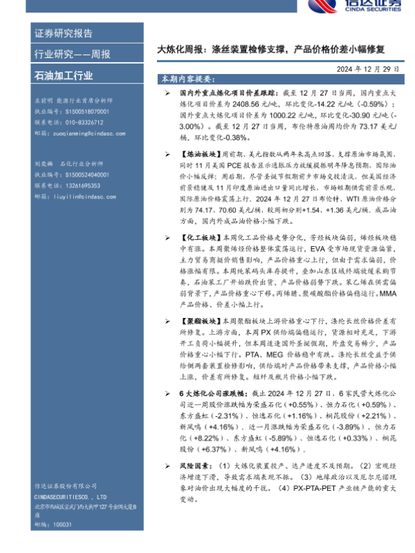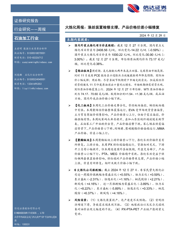 【信达证券】【20241229】大炼化周报:涤丝装置检修支撑,产品价格价差小幅修复-23页