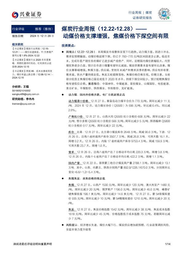 【兴业证券】【20241229】20241229-兴业证券-煤炭行业周报:动煤价格支撑增强,焦煤价格下探空间有限-14页