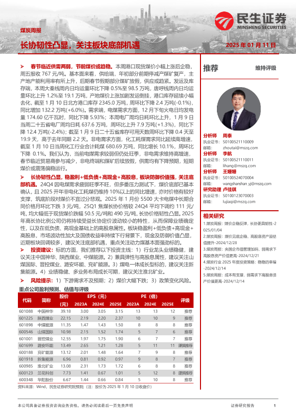【民生证券】【20250111】20250111-民生证券-煤炭周报:长协韧性凸显,关注板块底部机遇-21页