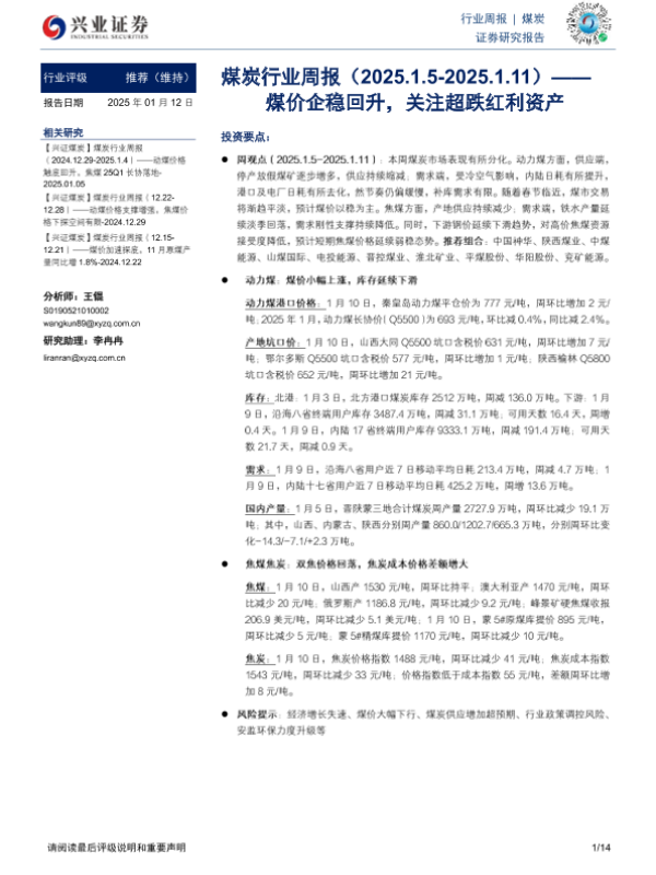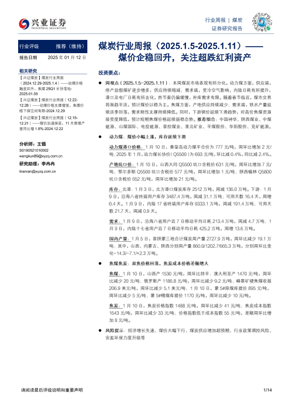 【兴业证券】【20250112】20250112-兴业证券-煤炭行业周报:煤价企稳回升,关注超跌红利资产-14页
