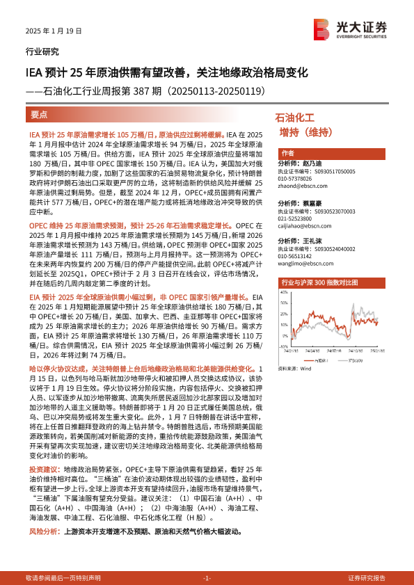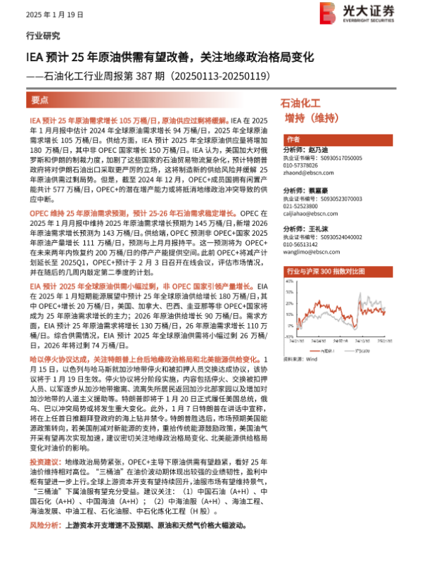 【光大证券】【20250119】20250119-光大证券-石油化工行业周报第387期:IEA预计25年原油供需有望改善,关注地缘政治格局变化-15页