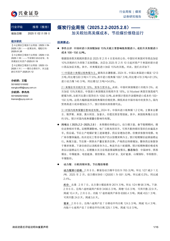 【兴业证券】【20250209】20250211-兴业证券-煤炭行业周报:加关税抬高美煤成本,节后煤价维稳运行-16页
