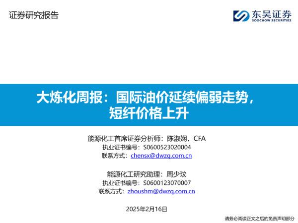 【东吴证券】【20250216】20250216-东吴证券-大炼化周报:国际油价延续偏弱走势,短纤价格上升-34页