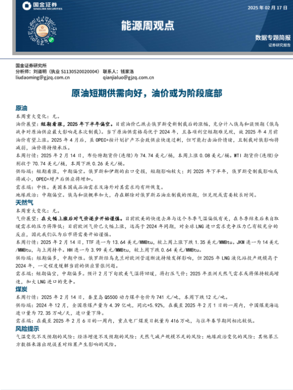 【国金证券】【20250217】20250217-国金证券-能源周观点:原油短期供需向好,油价或为阶段底部-15页