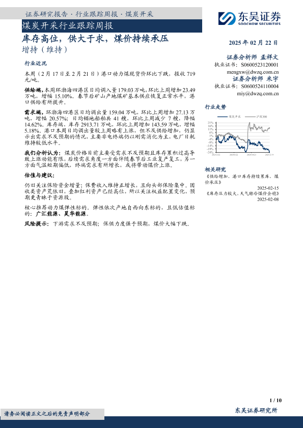 【东吴证券】【20250222】20250222-东吴证券-煤炭开采行业跟踪周报:库存高位,供大于求,煤价持续承压-10页