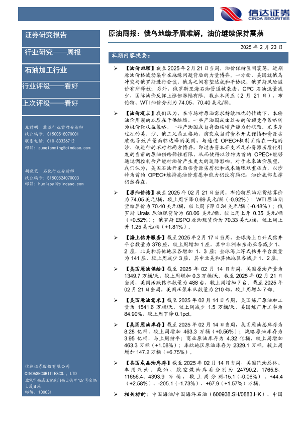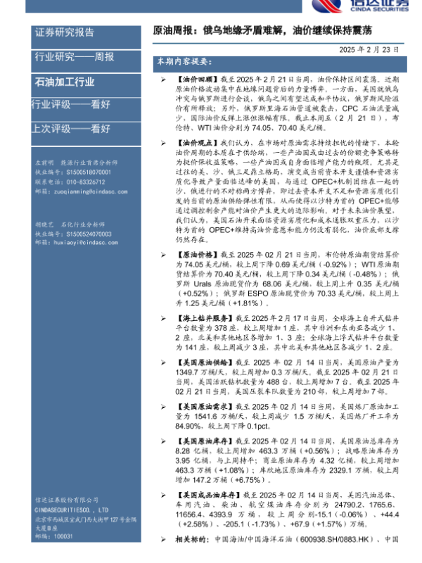 【信达证券】【20250223】原油周报:俄乌地缘矛盾难解,油价继续保持震荡-27页