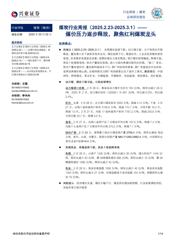 【兴业证券】【20250302】20250302-兴业证券-煤炭行业周报:煤价压力逐步释放,聚焦红利煤炭龙头-14页