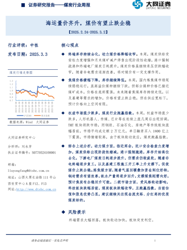 【大同证券】【20250303】大同证券-煤炭行业周报:海运量价齐升,煤价有望止跌企稳-13页