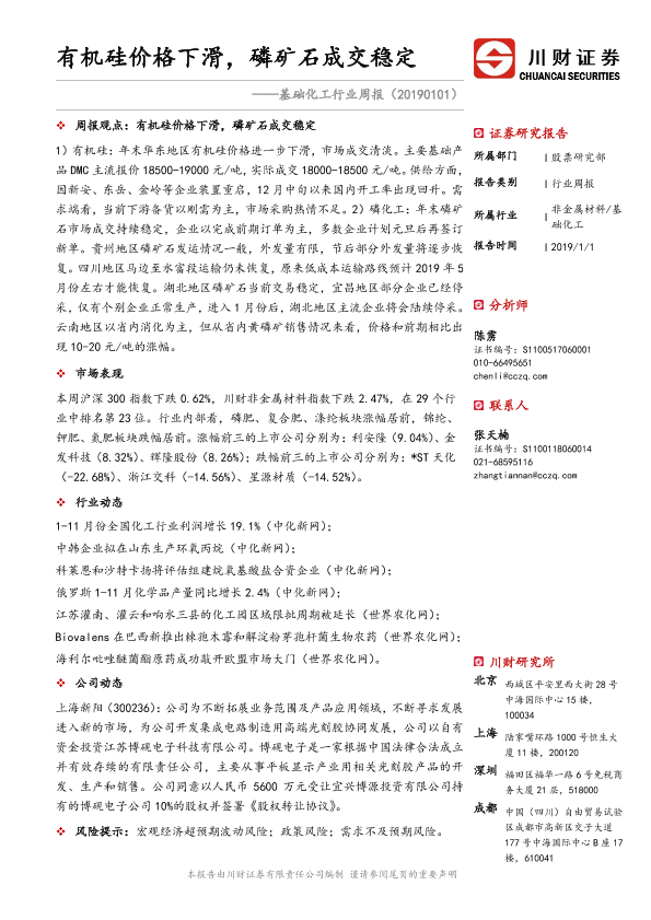 【川财证券】【20190101】基础化工行业周报:有机硅价格下滑,磷矿石成交稳定-21页