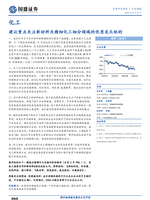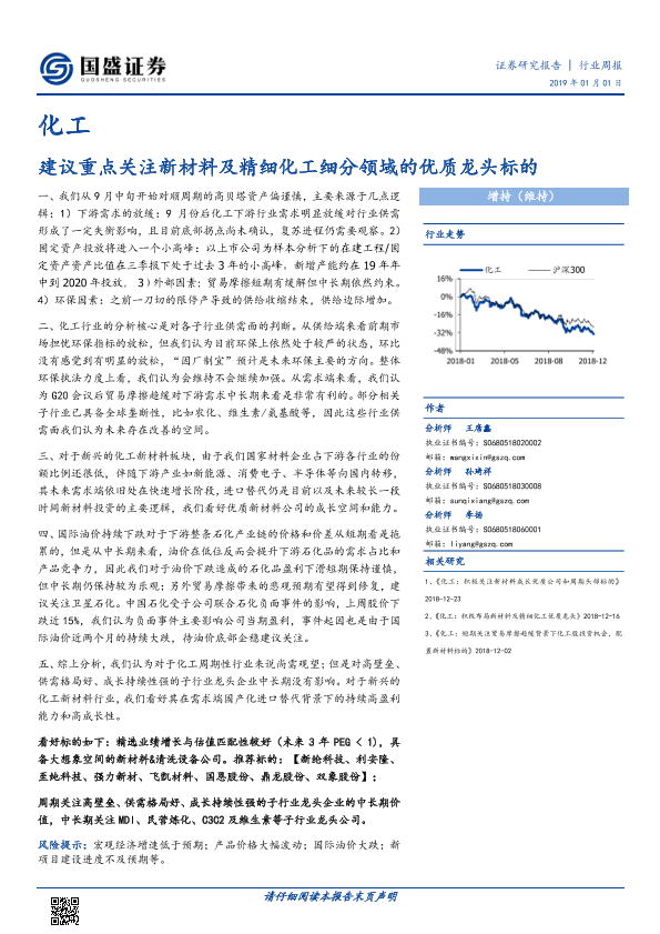 【国盛证券】【20190101】20190101-国盛证券-化工行业周报:建议重点关注新材料及精细化工细分领域的优质龙头标的-7页